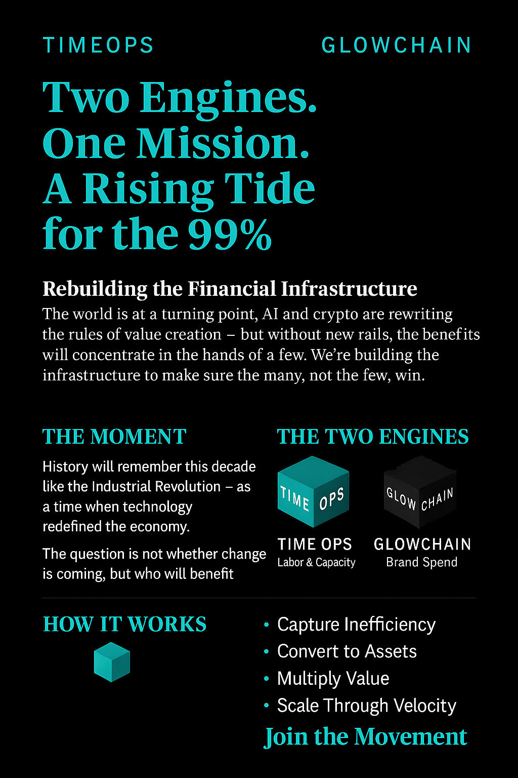 Converts advertising and sponsorship budgets into Glow Credits that fund community-scale participation and deliver measurable engagement. Every activation drives both impact and financial return.Together, these tracks form the first dual-rail economic system — where labor capacity and brand spend compound value through the same trusted infrastructure.